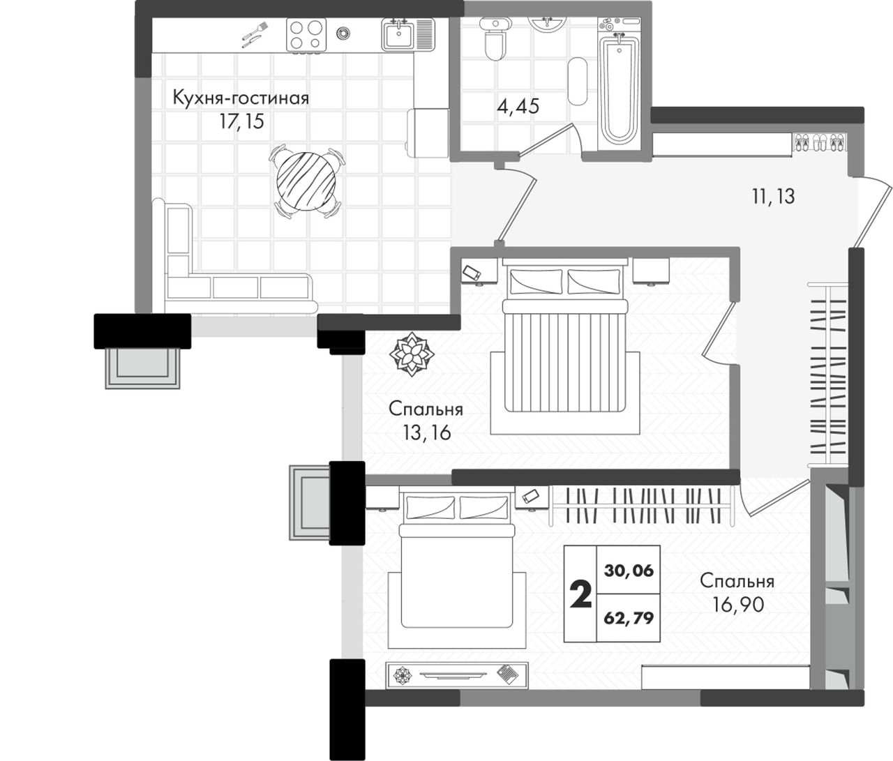 2-комнатная — 62,79 м² 1/9 эт. в Зелёная территория