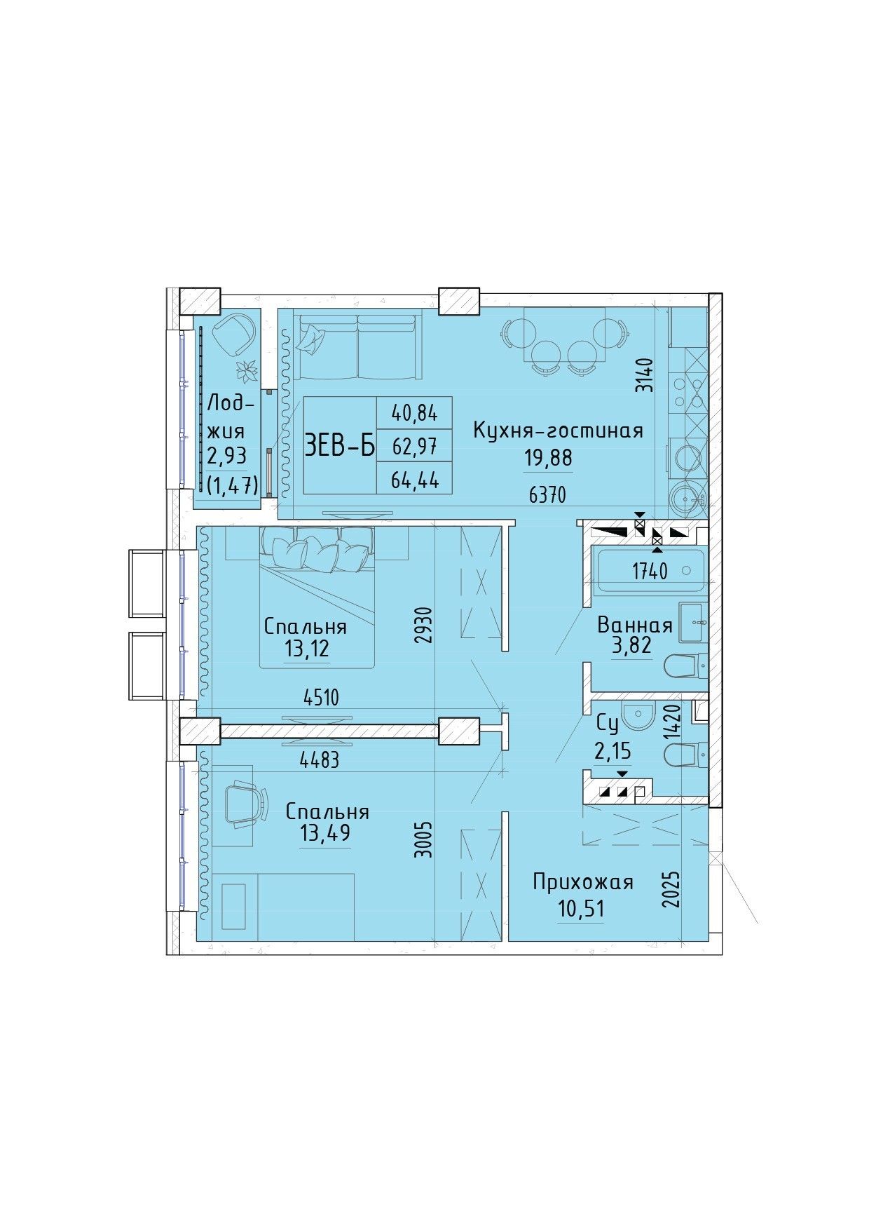 2-комнатная — 64,45 м² 2/20 эт. в Орион