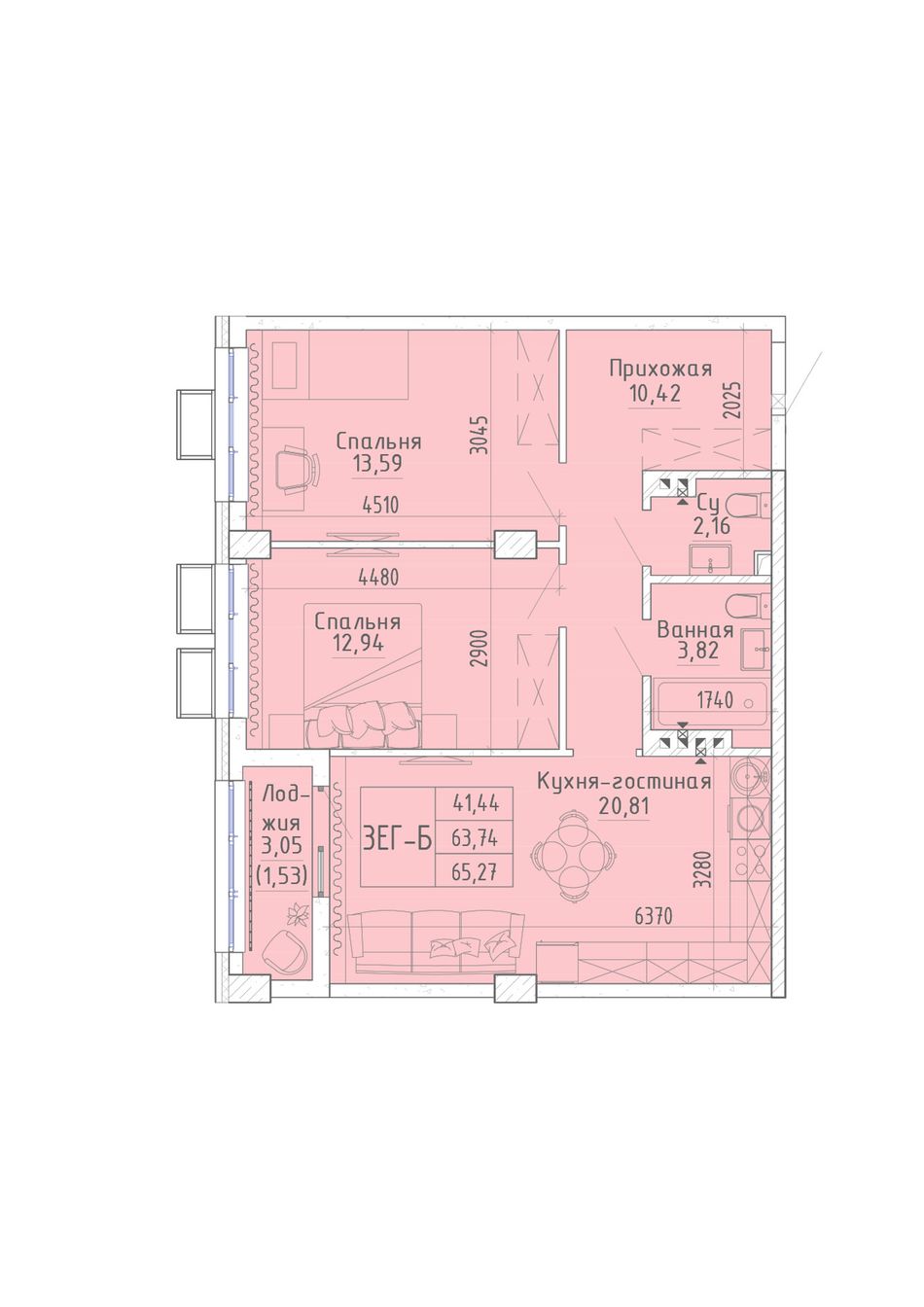 2-комнатная — 65 м² 4/20 эт. в Орион