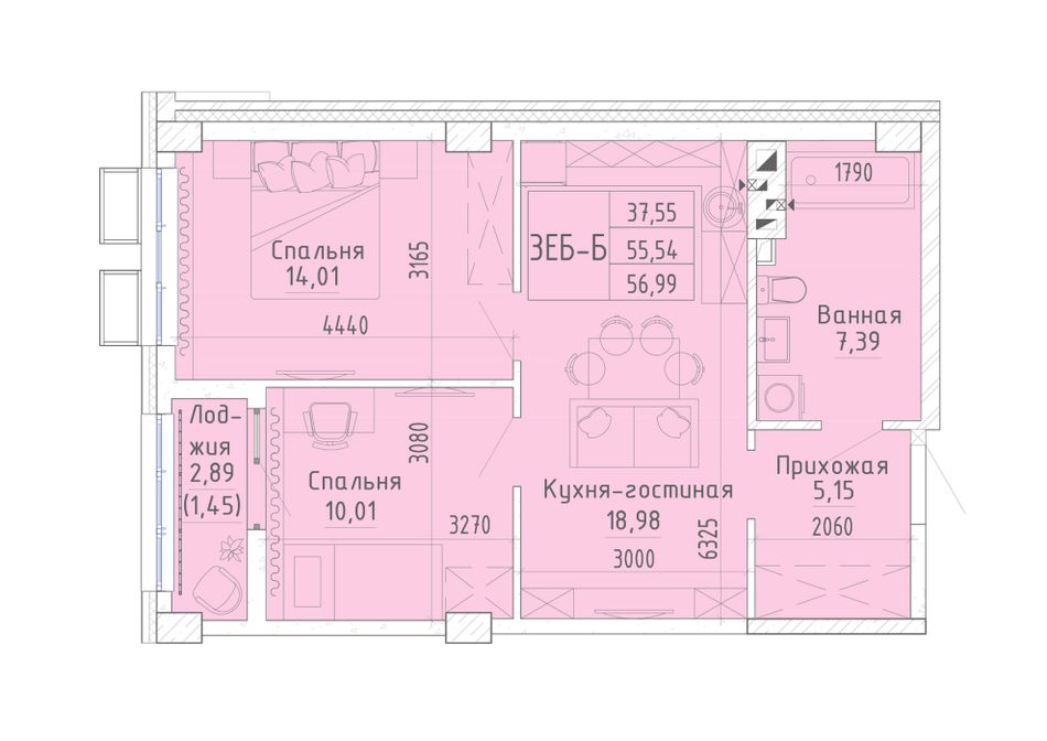 2-комнатная — 56,84 м² 5/20 эт. в Орион