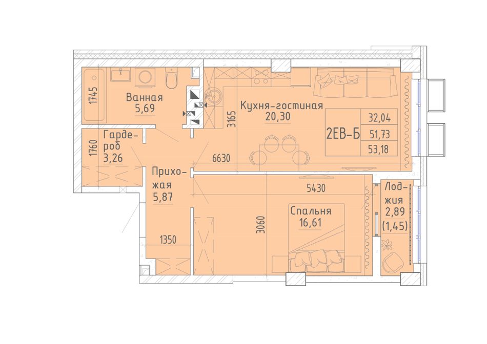 1-комнатная — 52,61 м² 6/20 эт. в Орион