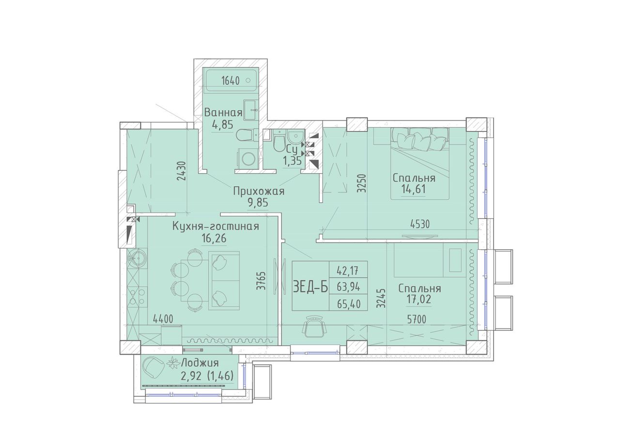 2-комнатная — 65,27 м² 6/20 эт. в Орион