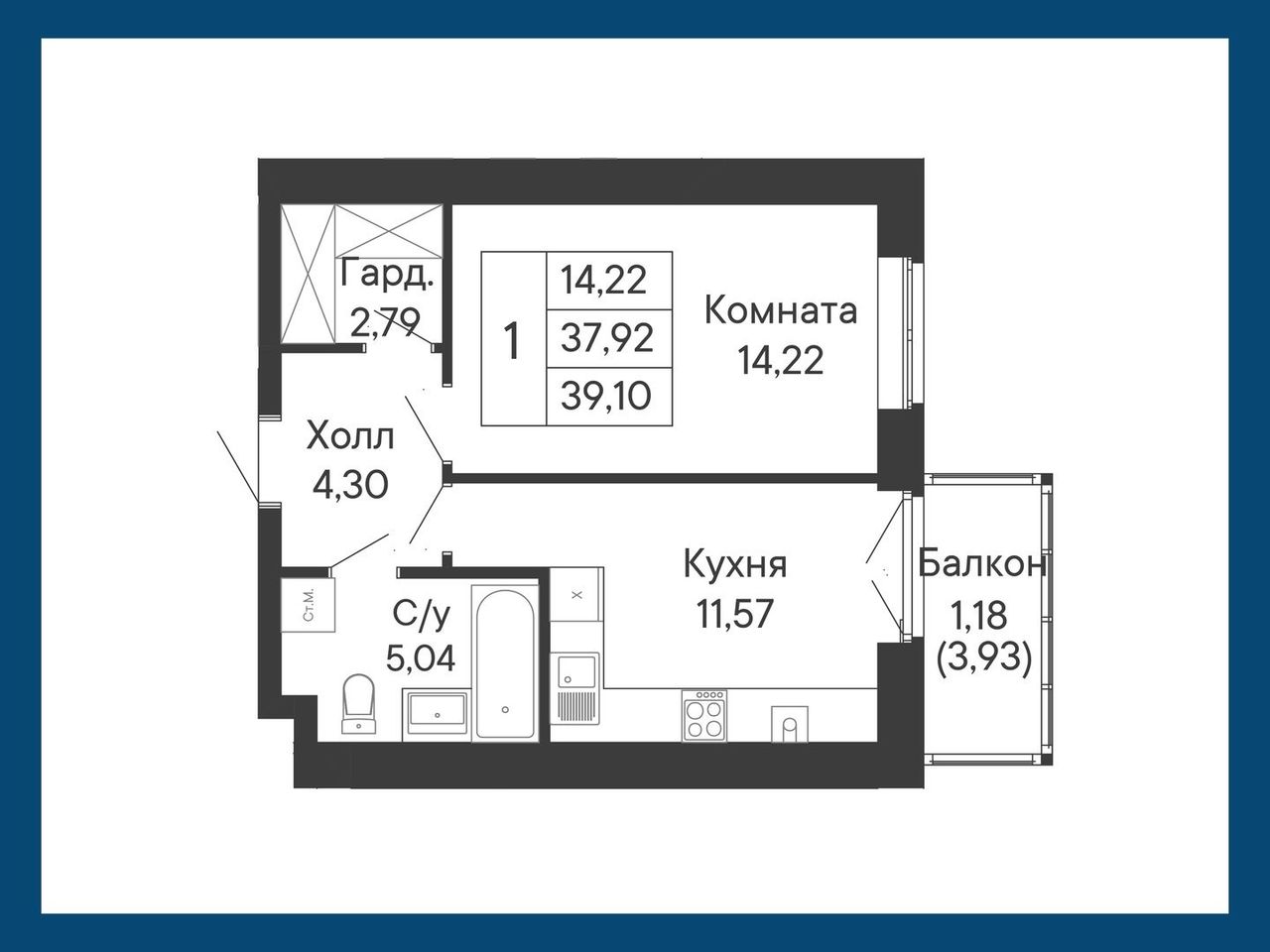 1-комнатная — 39,1 м² 5/8 эт. в Ривьера