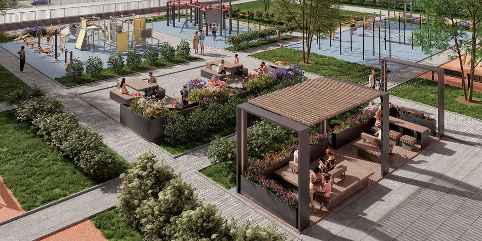 Во дворе предусмотрены зоны отдыха, чтобы жители могли расслабиться за стаканчиком кофе на свежем воздухе. Классные детские и спортивные площадки оснащены современным оборудованием, где весело играть жителям любого возраста. Покрытие из резиновой крошки сделает прогулку безопасной и предотвратит появление луж. Во дворе высажены деревья, кустарники и декоративные растения, а ещё здесь появится широкая прогулочная аллея, ведущая к храму Петра и Февронии.
