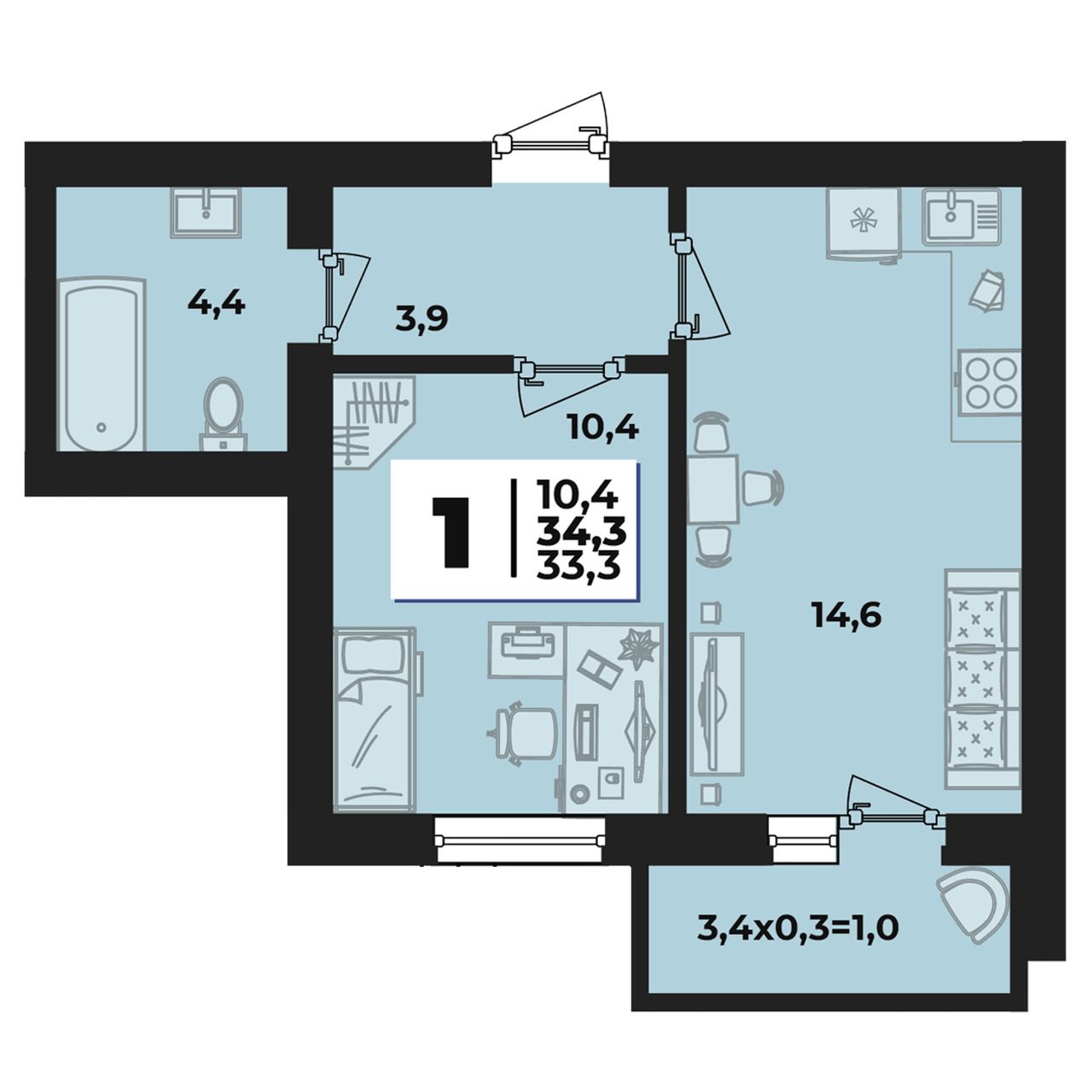 1-комнатная — 34,3 м² 1/5 эт. в Дарград