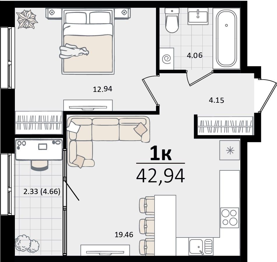 1-комнатная — 42,94 м² 11/16 эт. в Патрики