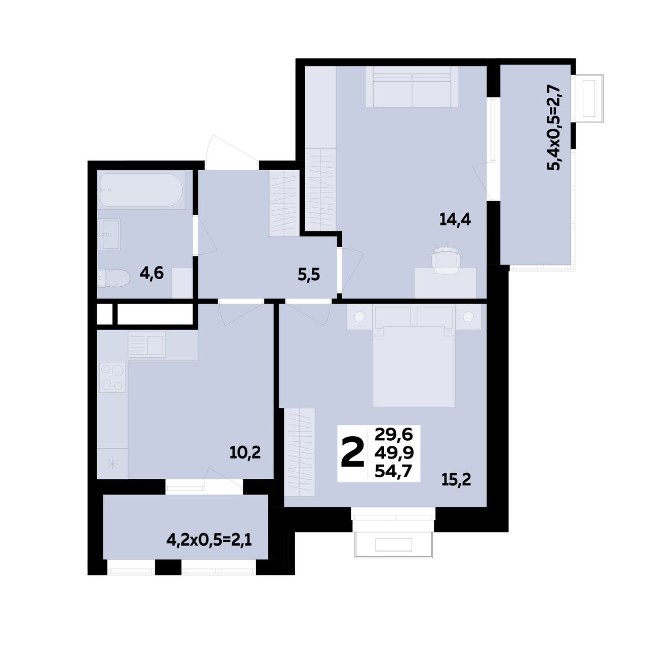 2-комнатная — 54,7 м² 2/16 эт. в МЕГАСИТИ