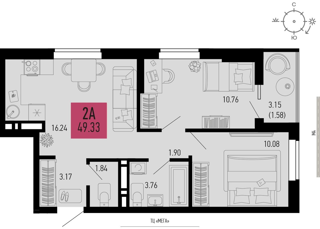 2-комнатная — 49,33 м² 17/18 эт. в Столицыно