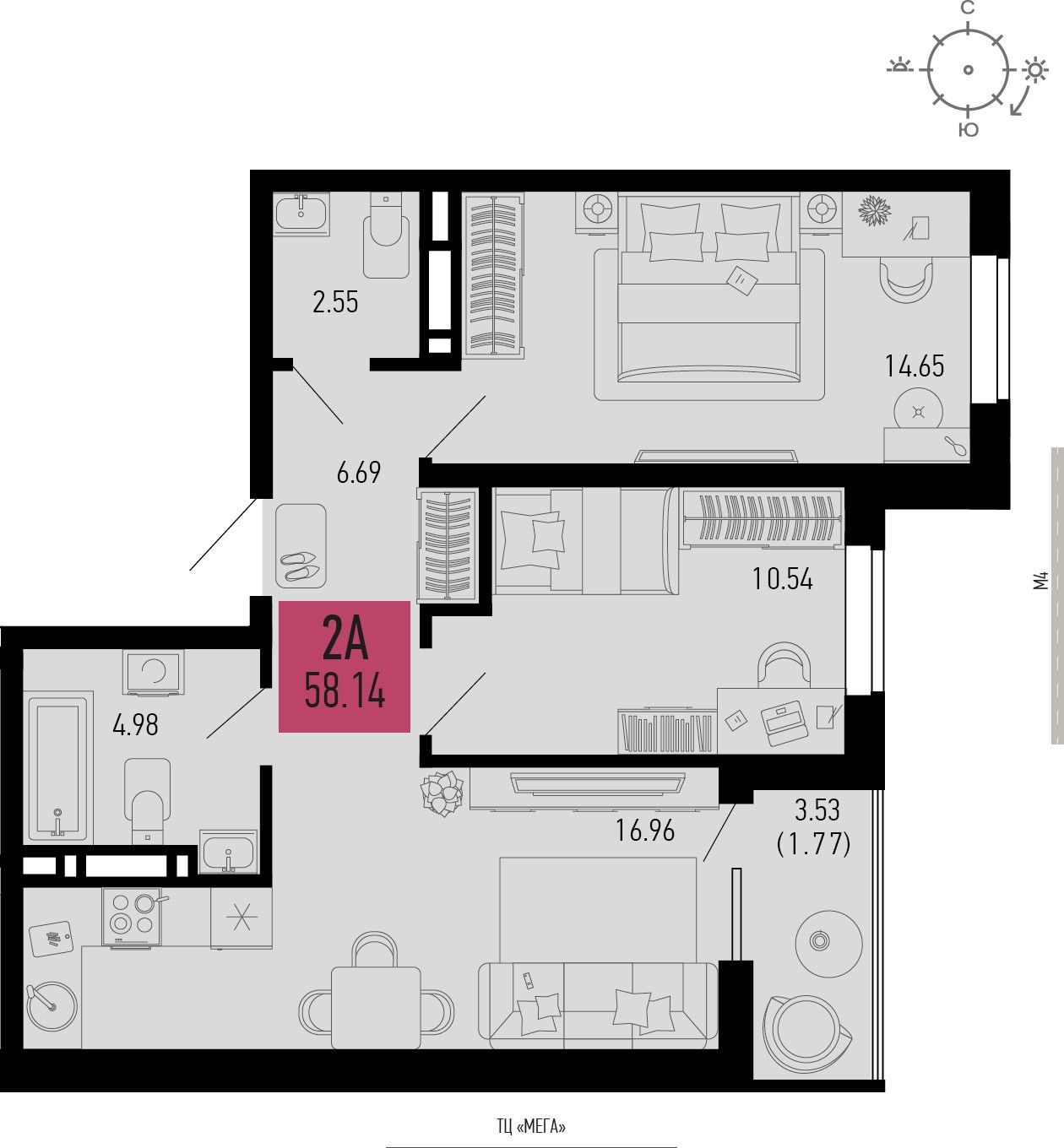 2-комнатная — 58,14 м² 12/18 эт. в Столицыно