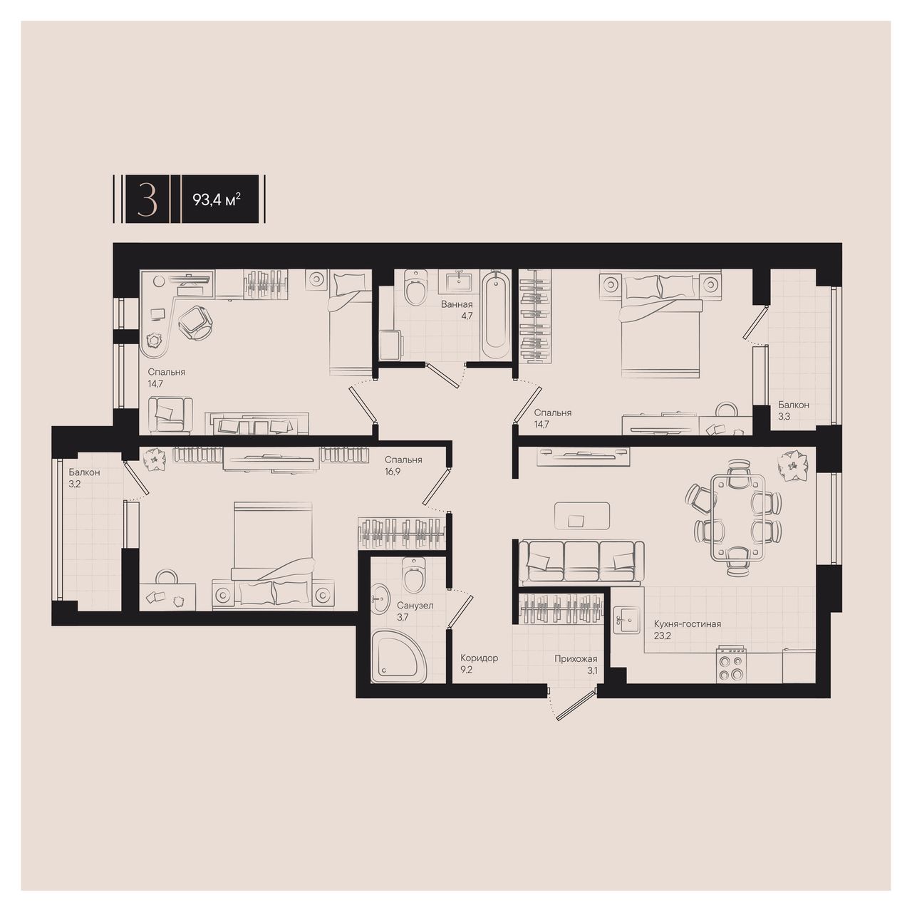 3-комнатная — 93,4 м² 2/18 эт. в Эрмитаж