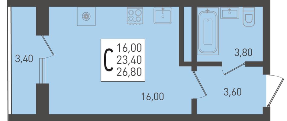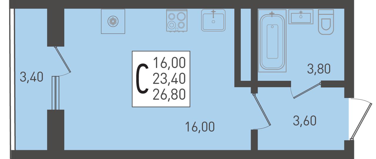 | Студия | 26 - 42 м² | 3,5 - 7 млн ₽ |