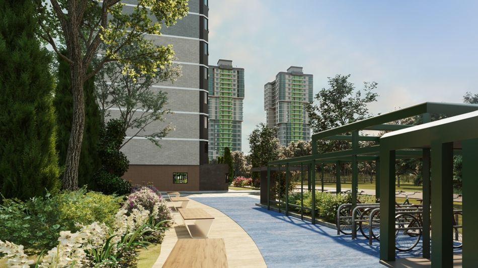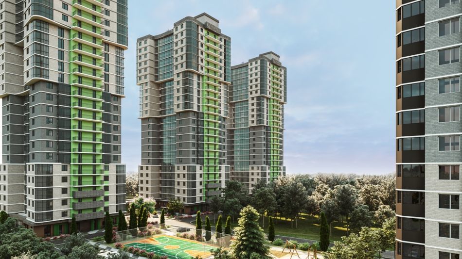 Яркие фасады с панорамным остеклением, благоустроенная территория, детские и спортивные площадки во дворе комплекса.