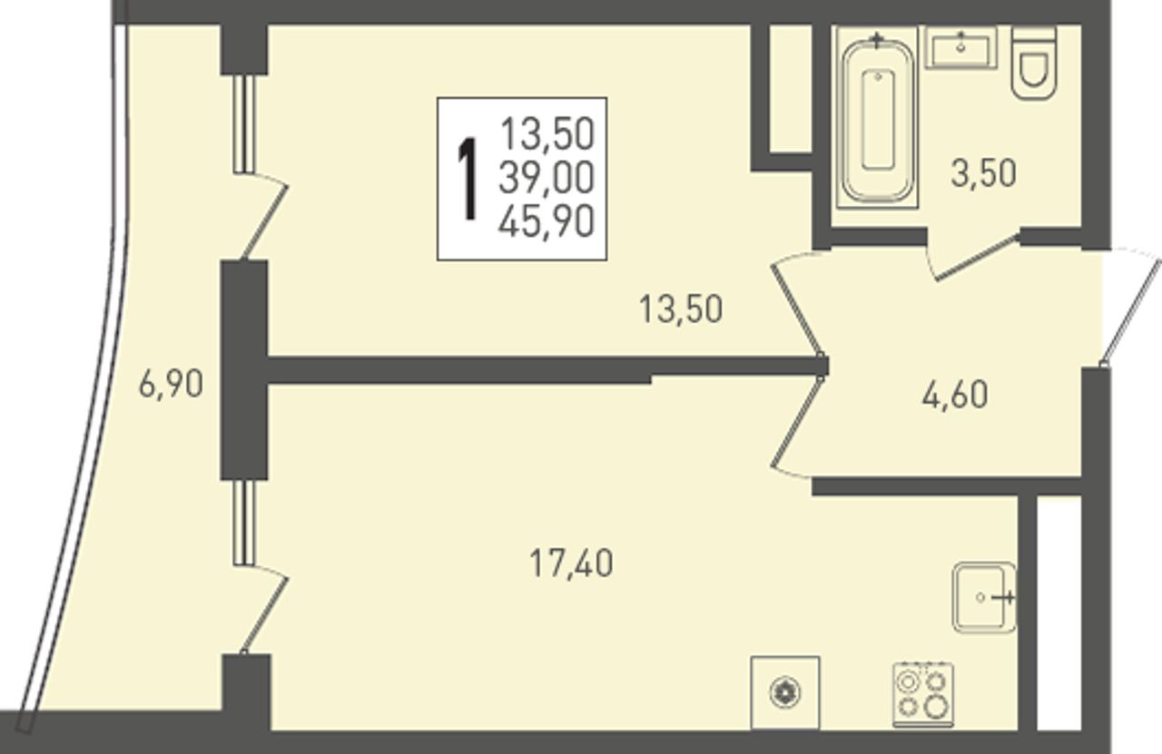 | 1-комн. | 38 - 47 м² | 3,9 - 4,6 млн ₽ |