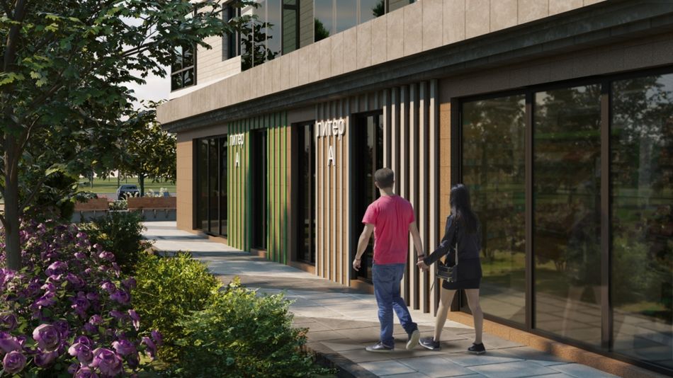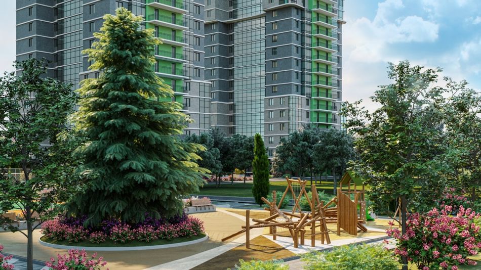 Яркие фасады с панорамным остеклением, благоустроенная территория, детские и спортивные площадки во дворе комплекса.