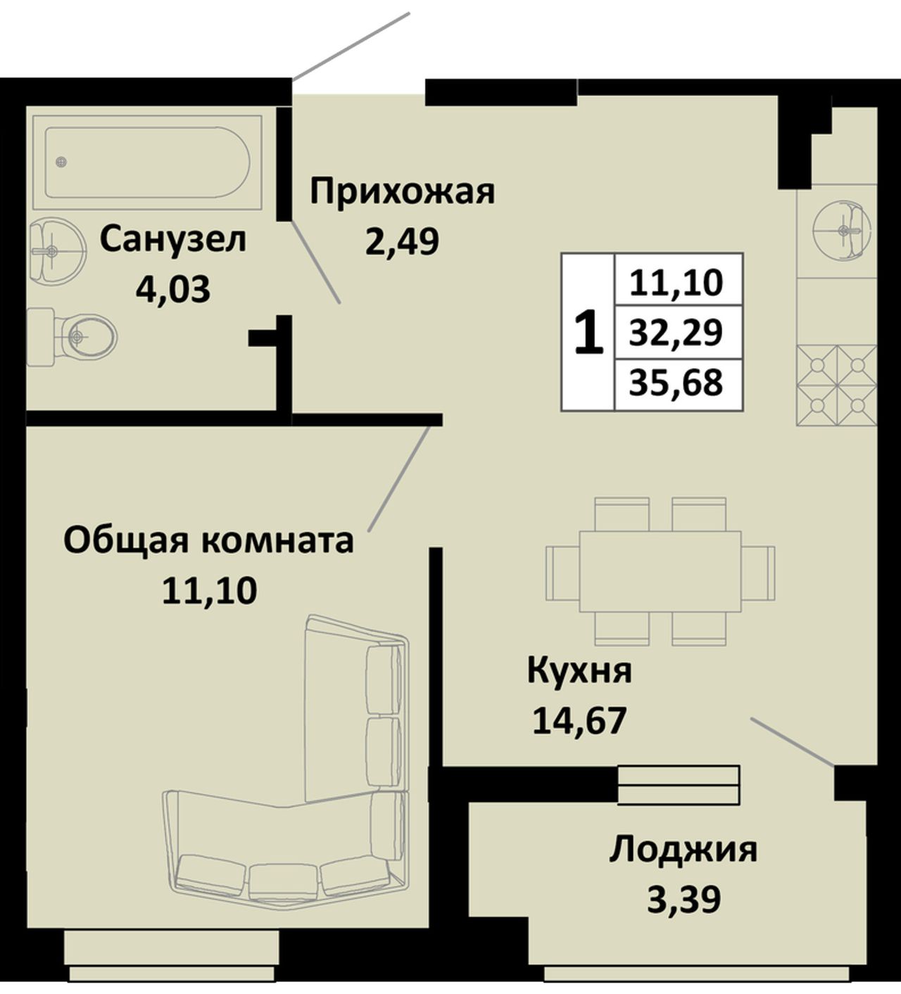 1-комнатная — 35,68 м² 1/4 эт. в Южные соседи