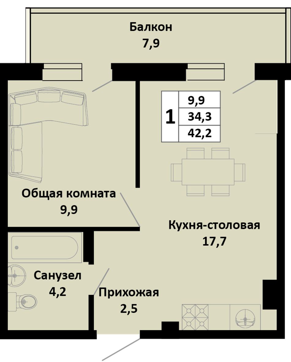 | Студия | 26 - 42 м² | 3,5 - 7 млн ₽ |