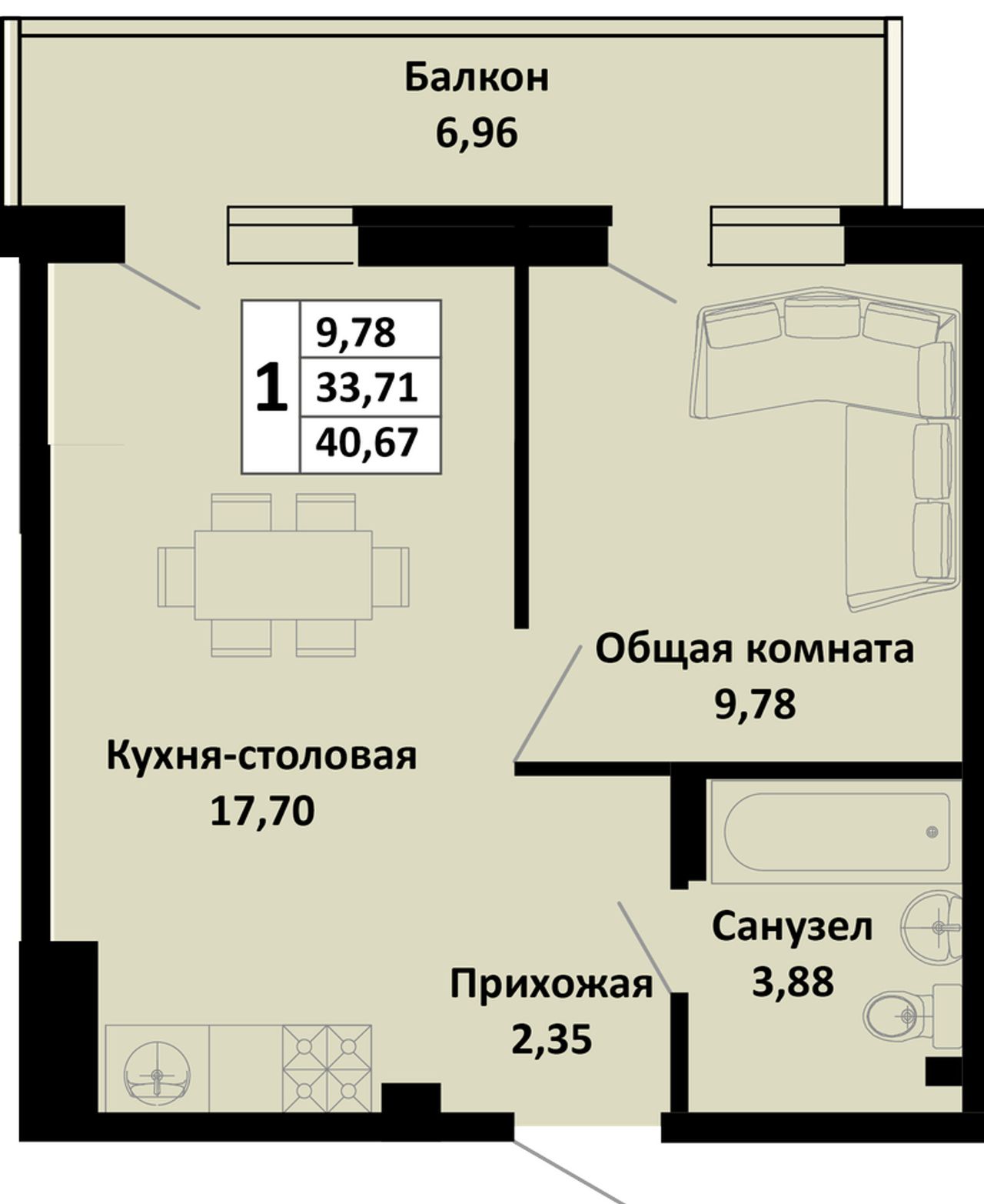 Общая площадь40,67 м²