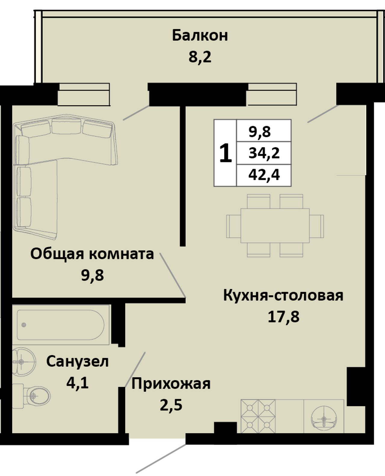 Общая площадь42,4 м²