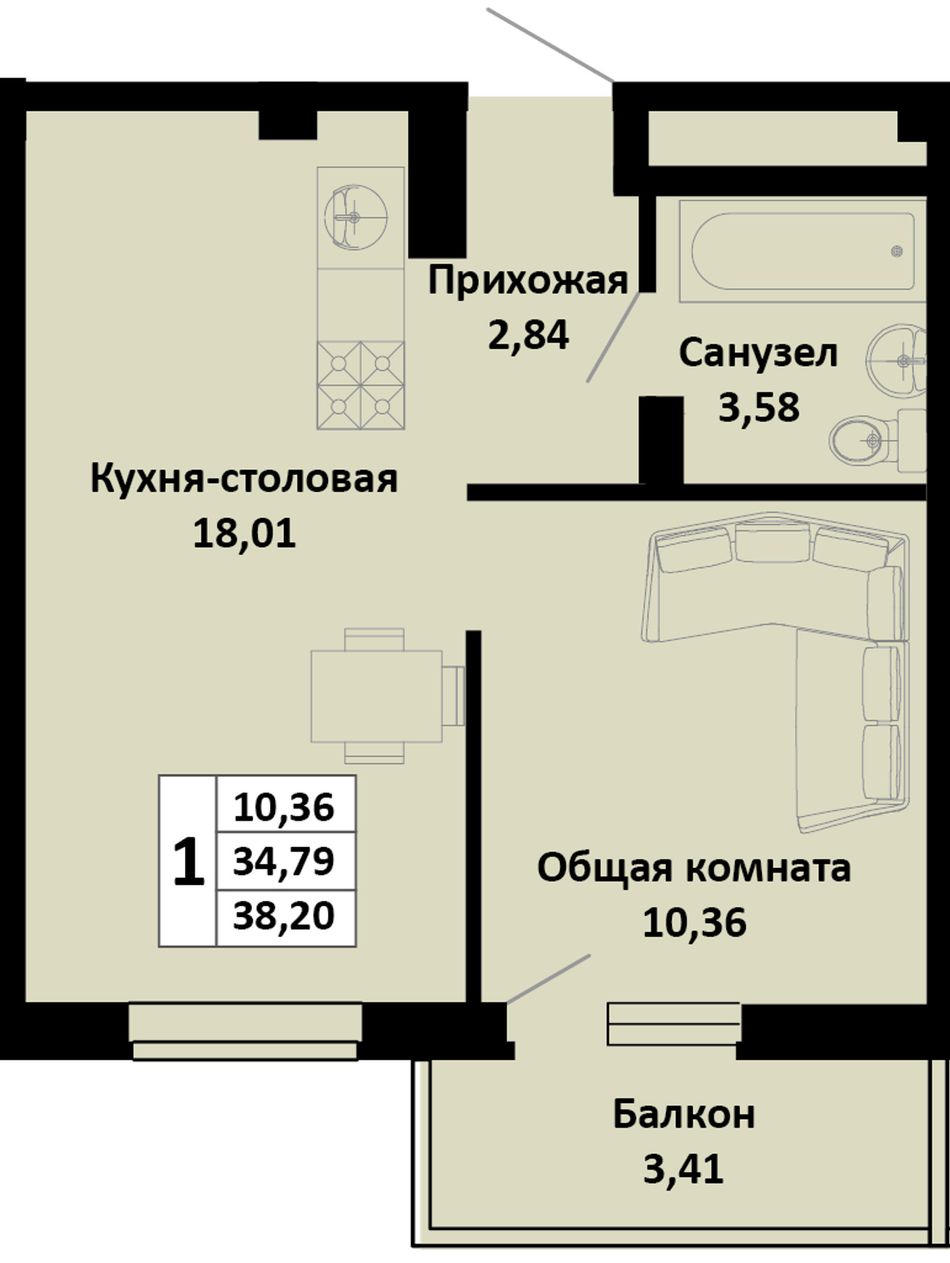 1-комнатная — 39,2 м² 4/4 эт. в Южные соседи