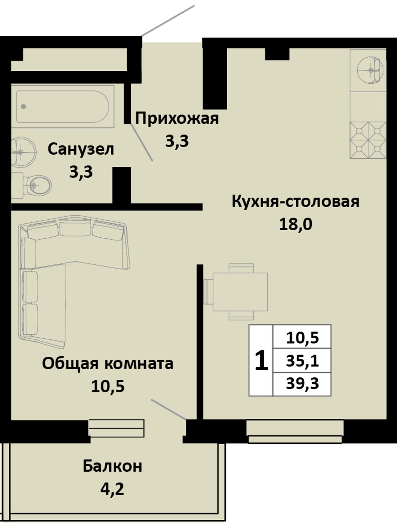 Общая площадь39,3 м²