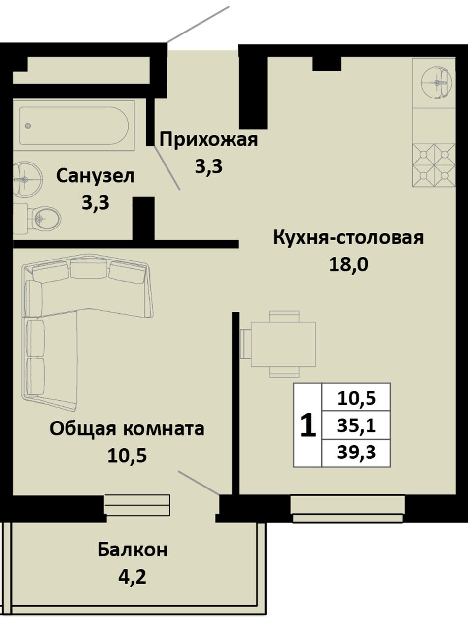 1-комнатная — 39,3 м² 4/4 эт. в Южные соседи