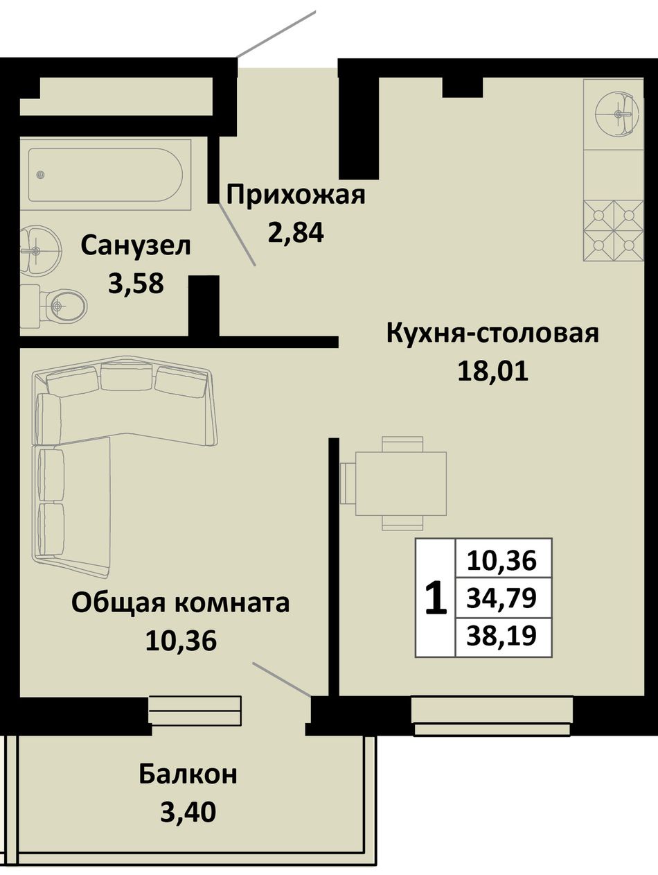 1-комнатная — 38,19 м² 4/4 эт. в Южные соседи