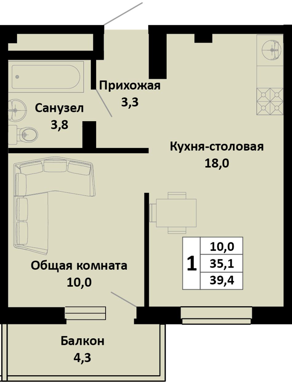 Общая площадь39,4 м²