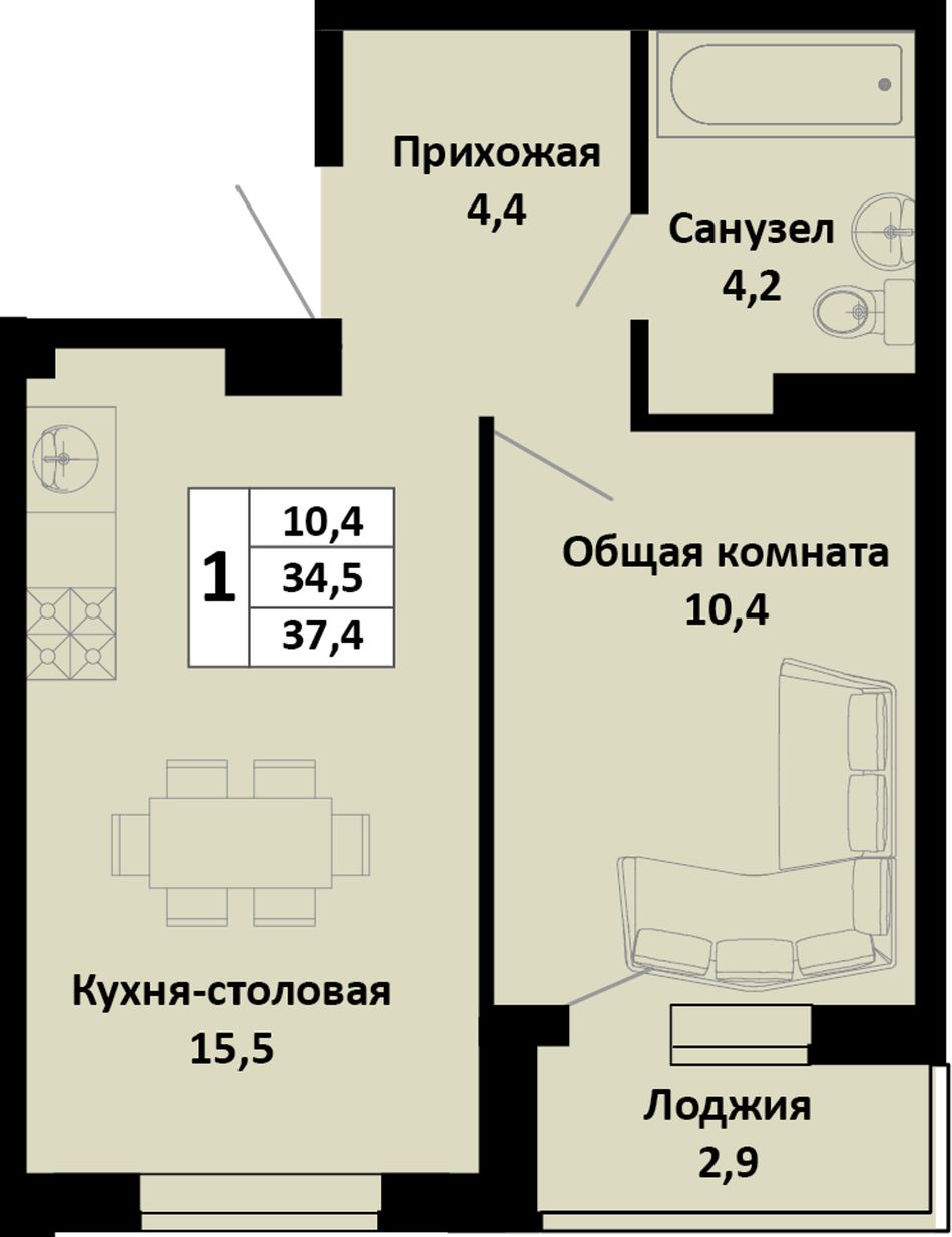 1-комнатная — 37,4 м² 4/4 эт. в Южные соседи