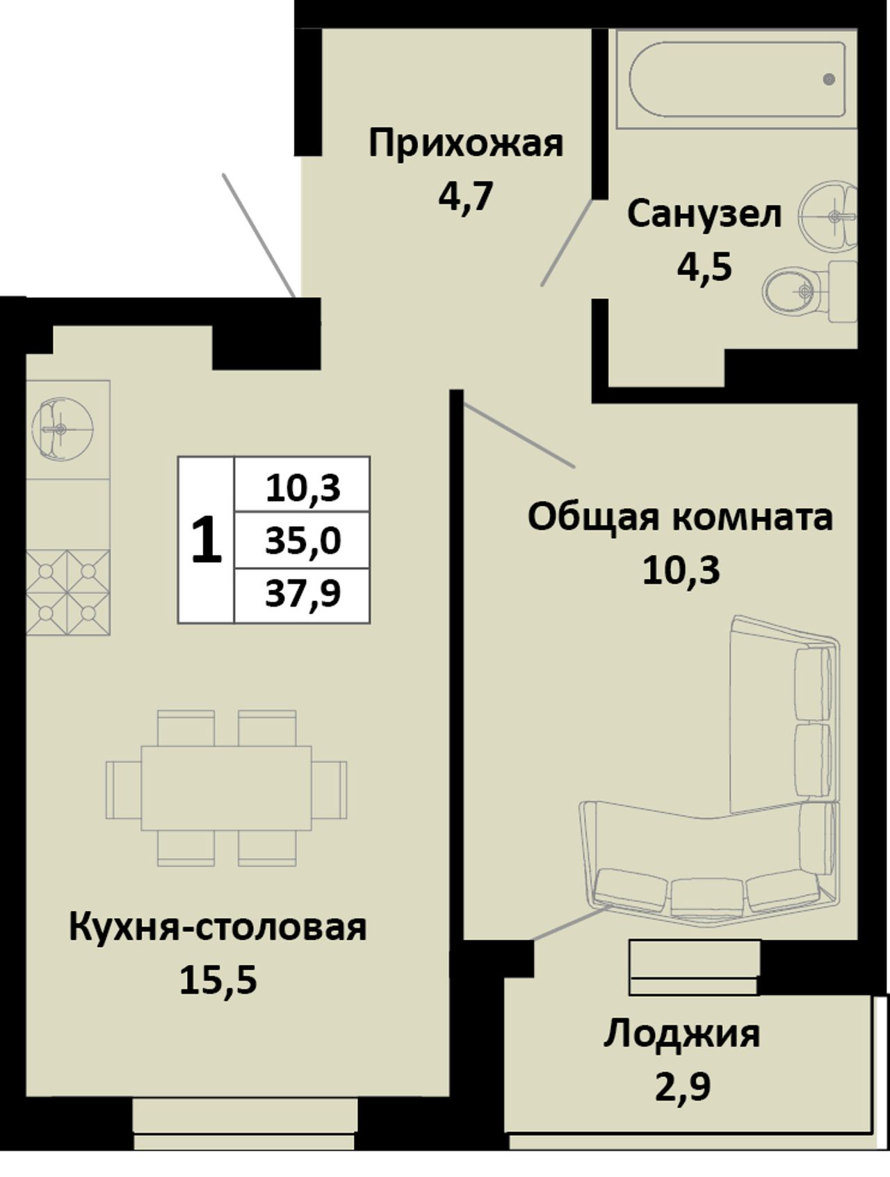 | 1-комн. | 37 - 47 м² | 3,9 - 5,1 млн ₽ |