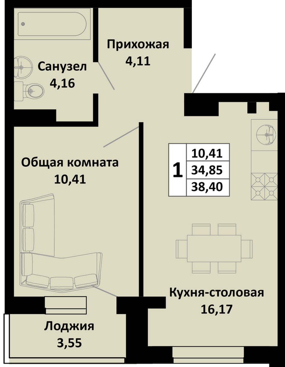 | 1-комн. | 38 - 47 м² | 3,9 - 4,6 млн ₽ |