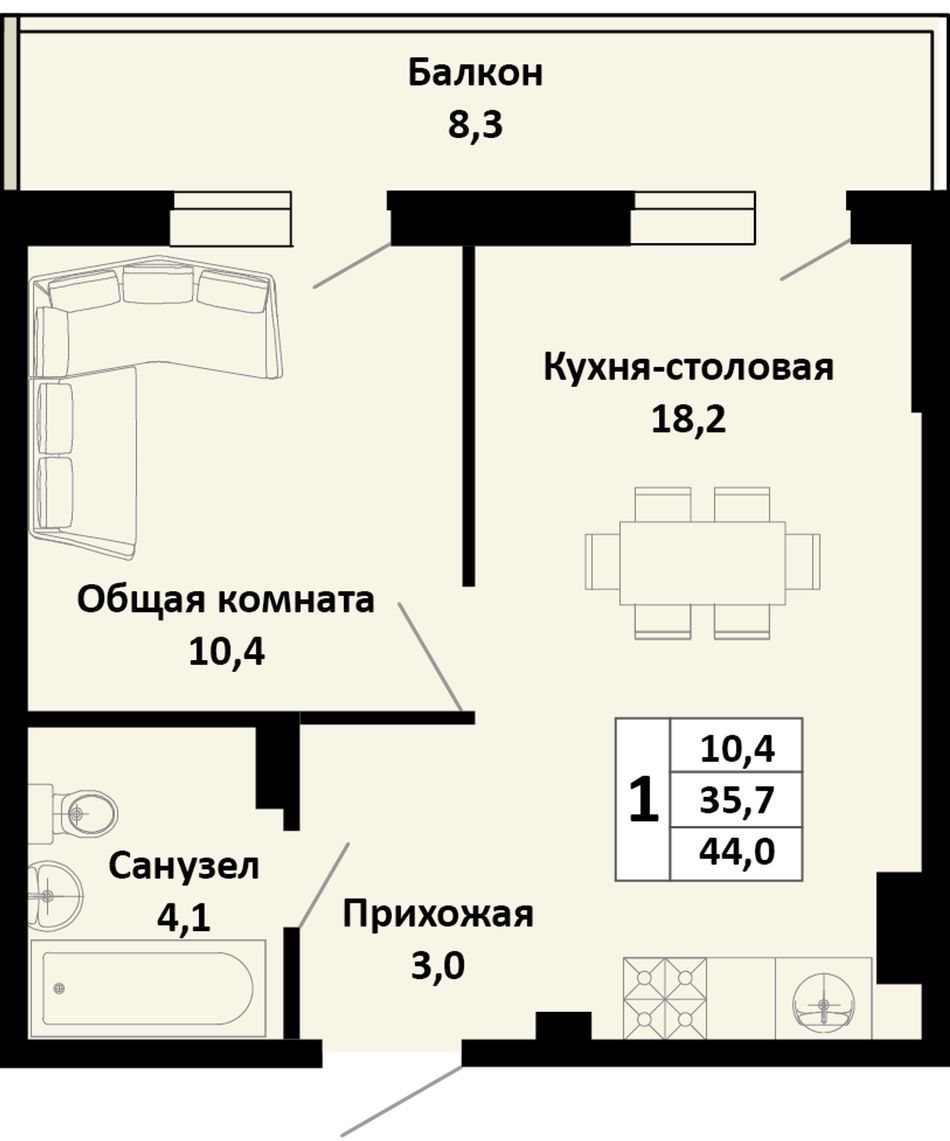 1-комнатная — 44 м² 2/4 эт. в Южные соседи
