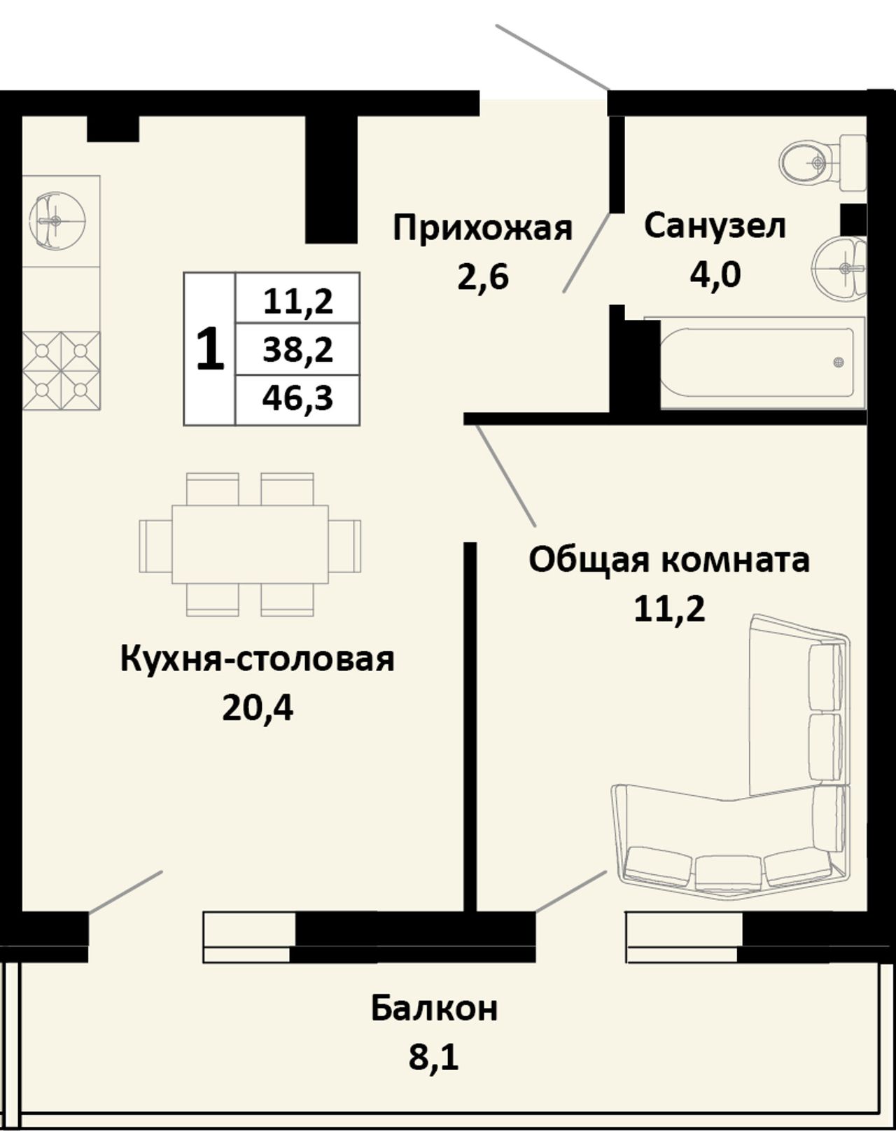 1-комнатная — 46,3 м² 3/4 эт. в Южные соседи