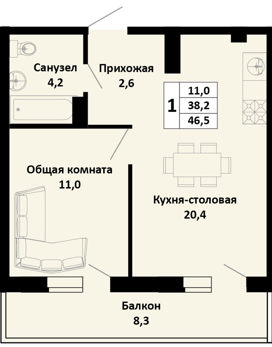 | 1-комн. | 37 - 47 м² | 3,9 - 5,1 млн ₽ |