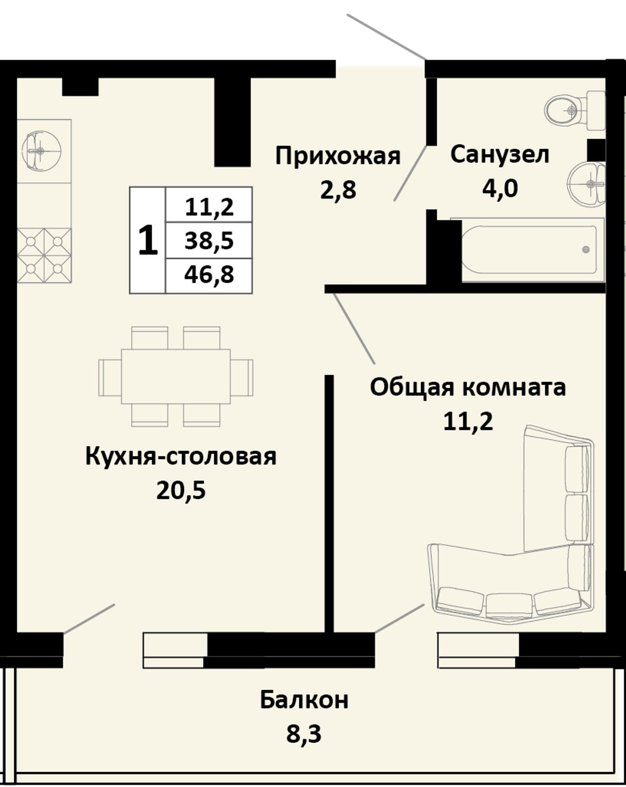 Общая площадь46,8 м²
