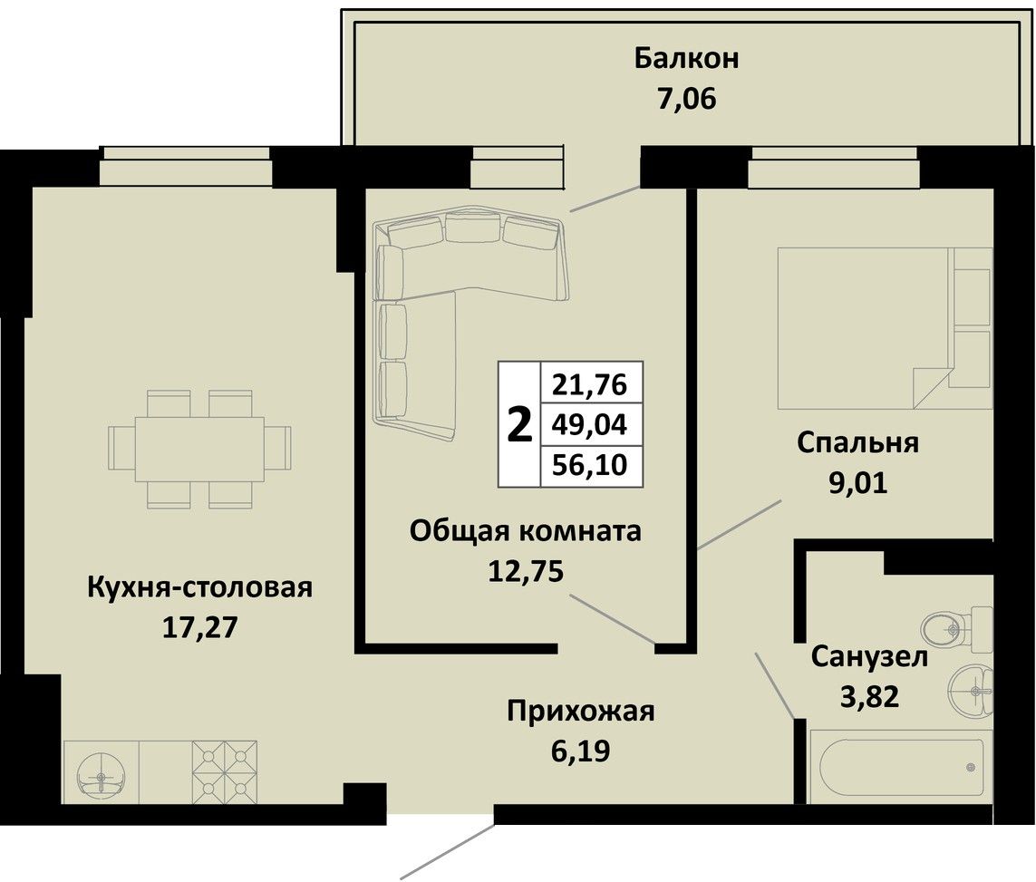 2-комнатная — 56,1 м² 3/4 эт. в Южные соседи