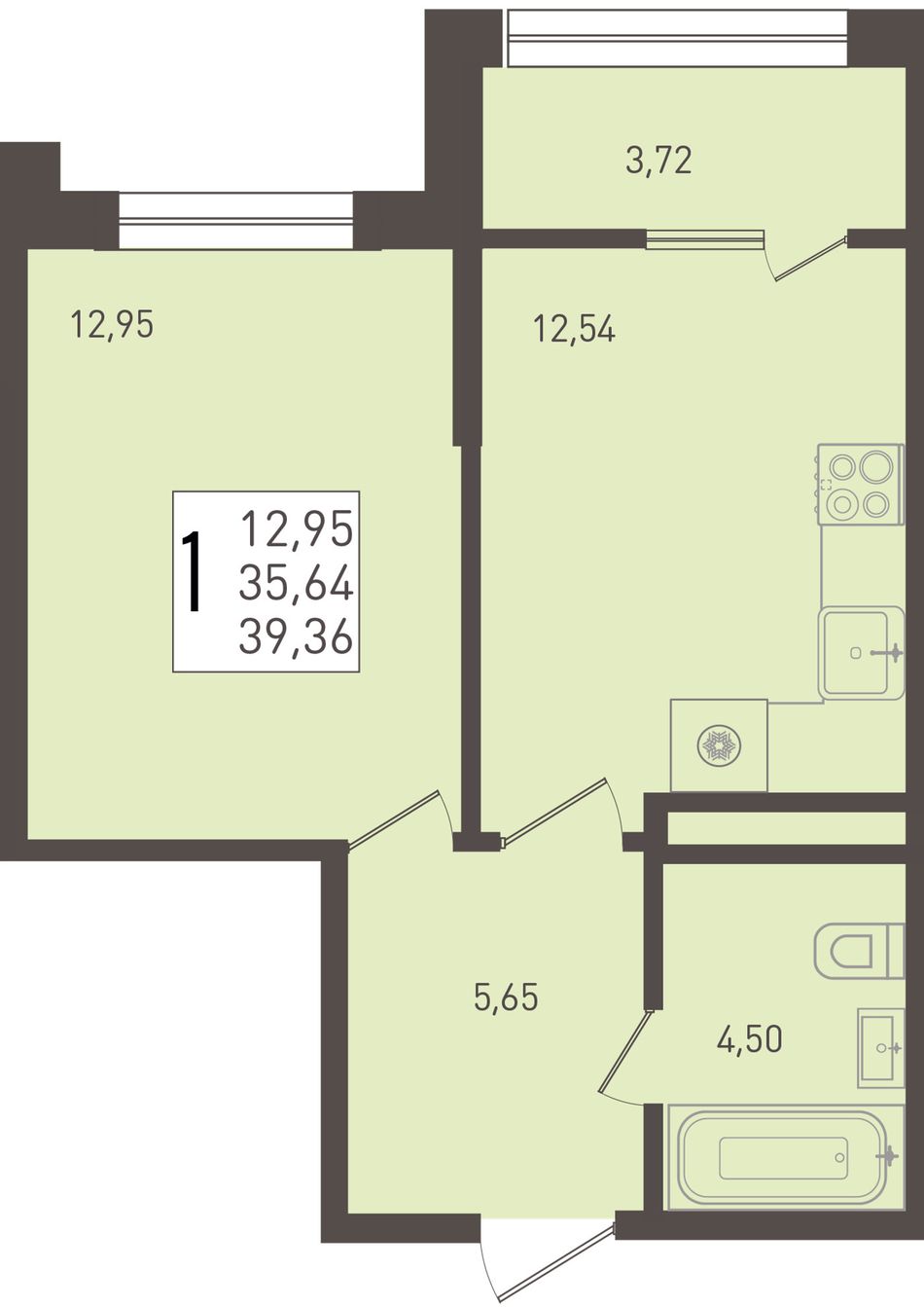 1-комнатная — 39,36 м² 7/9 эт. в ЮГГЕ