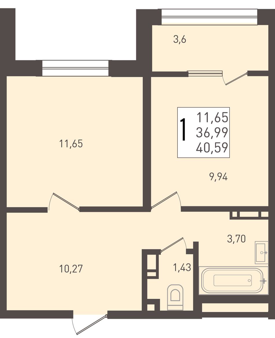 1-комнатная — 40,59 м² 9/9 эт. в ЮГГЕ