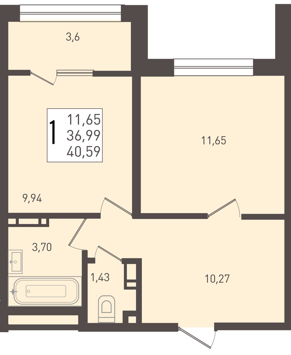 1-комнатная — 40,59 м² 7/9 эт. в ЮГГЕ