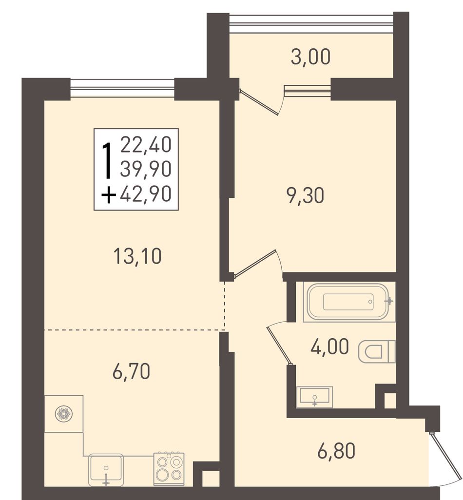 Общая площадь42,9 м²