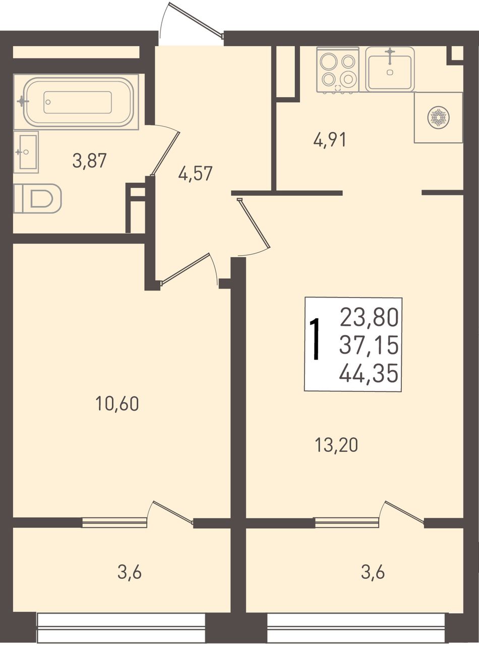 1-комнатная — 44,35 м² 6/9 эт. в ЮГГЕ