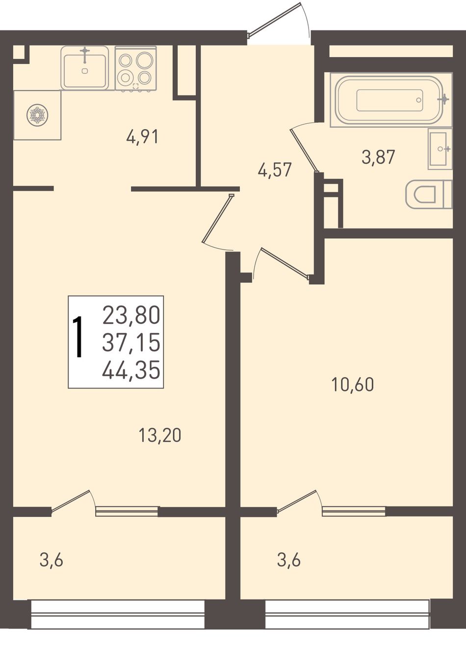 1-комнатная — 44,35 м² 7/9 эт. в ЮГГЕ
