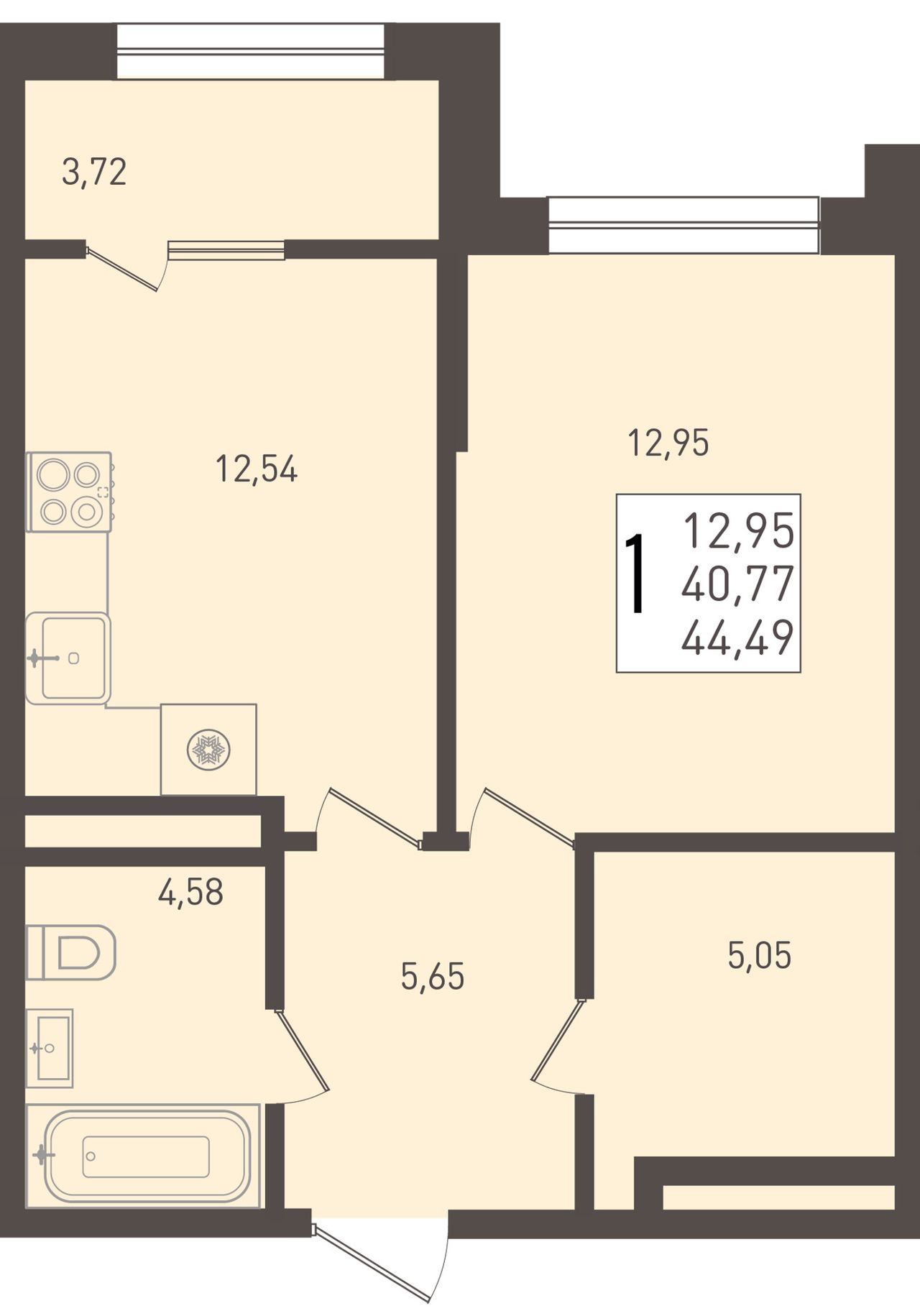 1-комнатная — 44,49 м² 4/9 эт. в ЮГГЕ