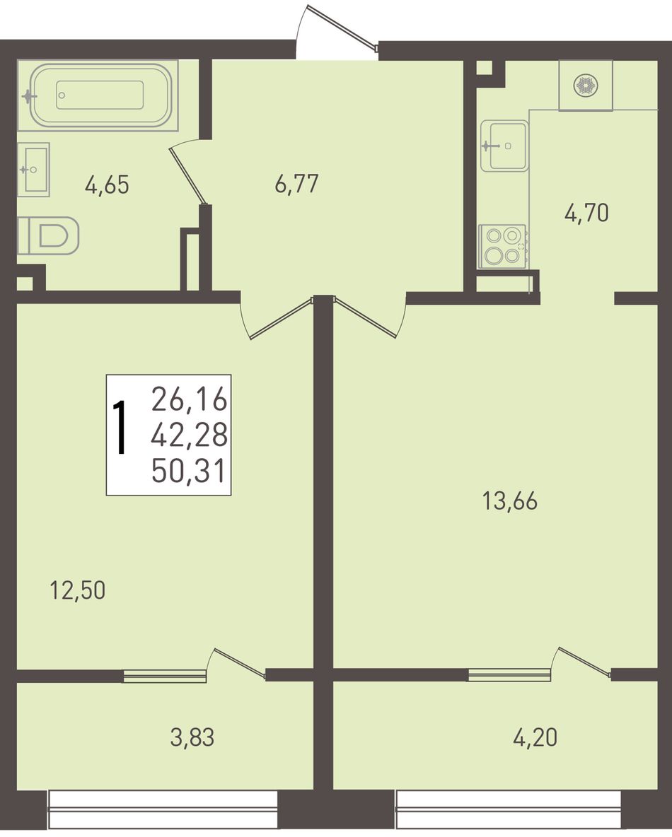 1-комнатная — 50,31 м² 6/9 эт. в ЮГГЕ