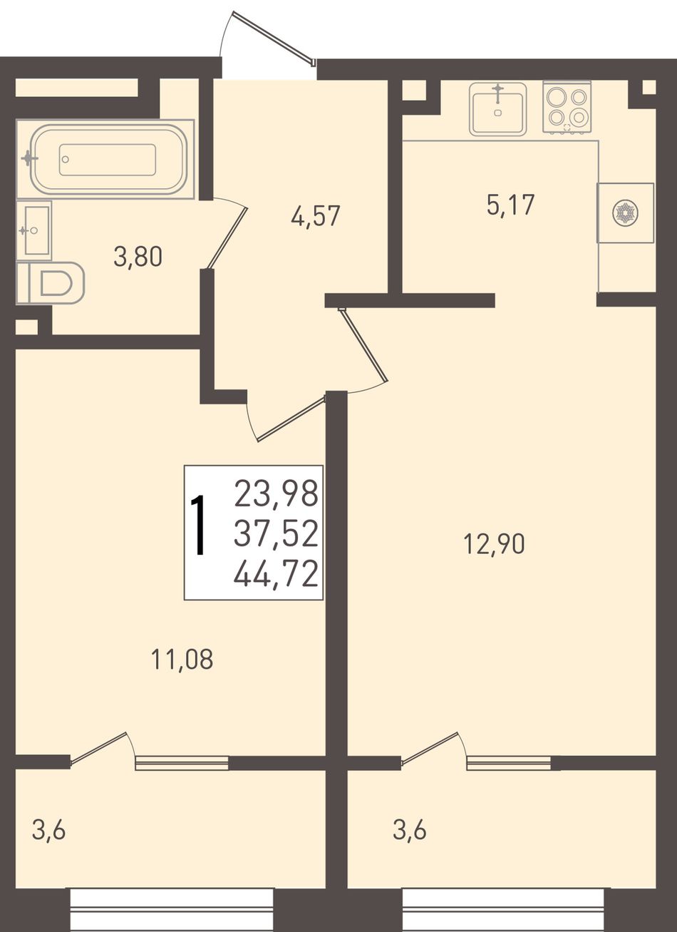 1-комнатная — 44,72 м² 1/9 эт. в ЮГГЕ