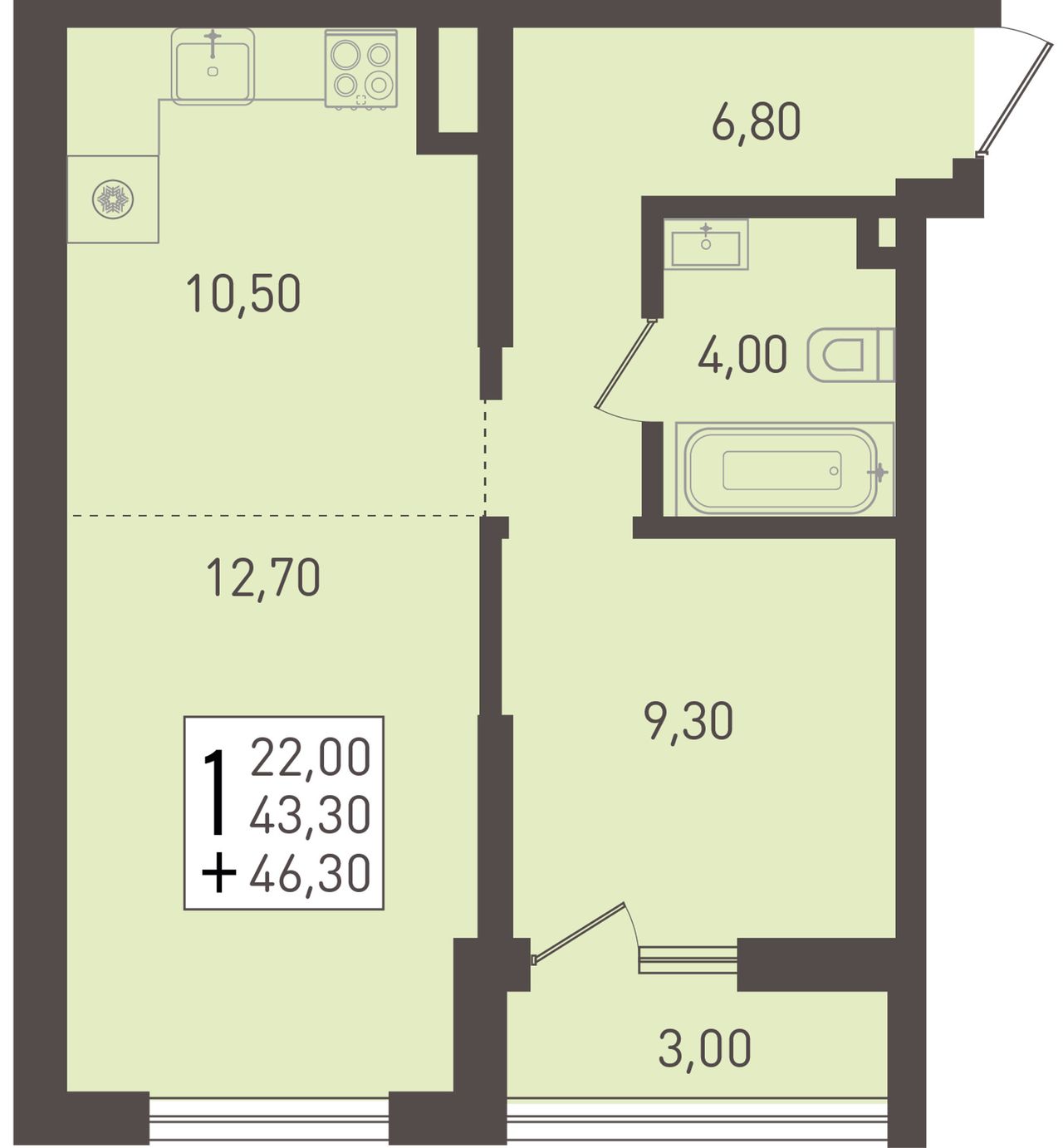 1-комнатная — 46,3 м² 1/8 эт. в ЮГГЕ