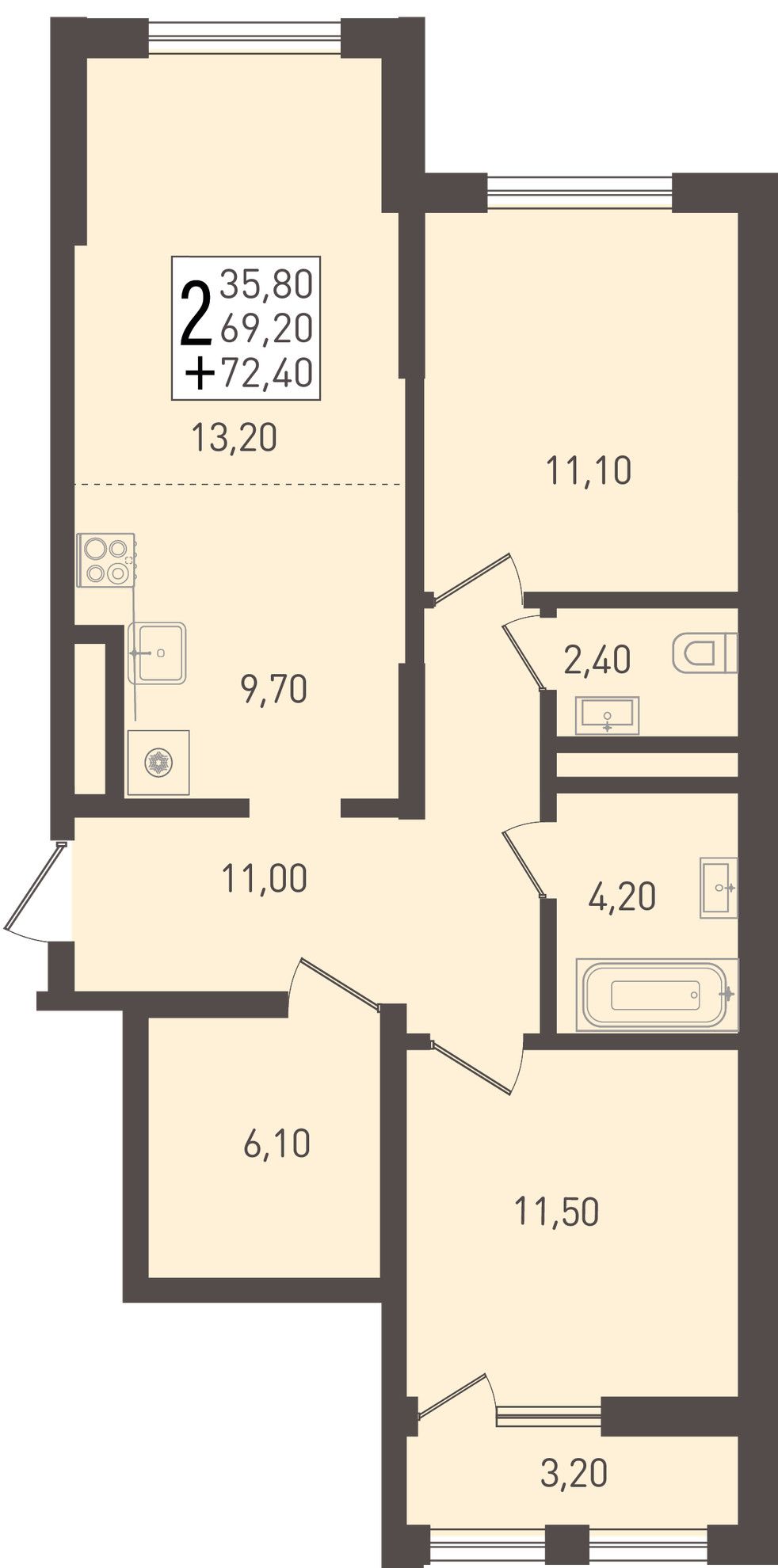 2-комнатная — 72,4 м² 3/8 эт. в ЮГГЕ