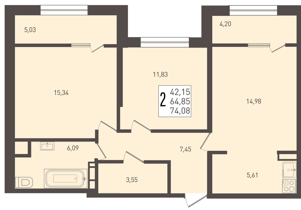 2-комнатная — 74,08 м² 2/9 эт. в ЮГГЕ