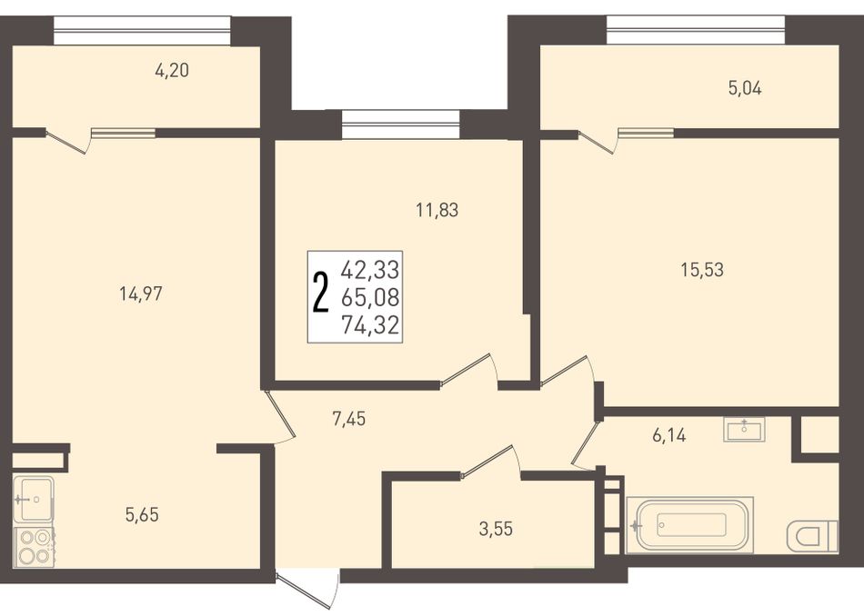 2-комнатная — 74,32 м² 5/9 эт. в ЮГГЕ