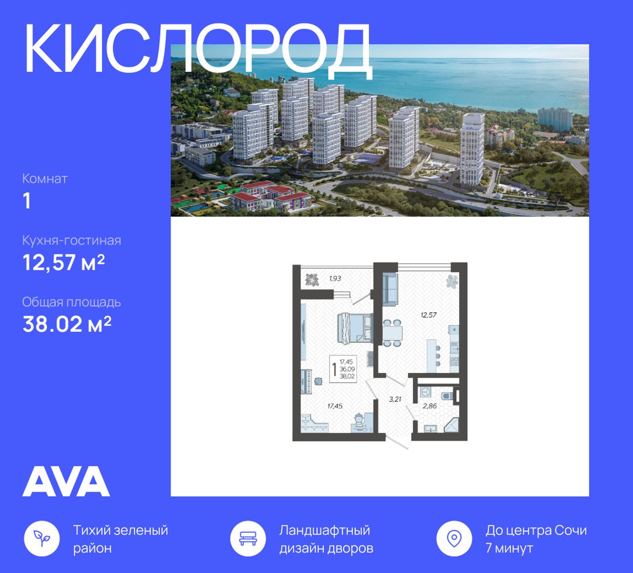 1-комнатная — 38,02 м² 18/19 эт. в Кислород