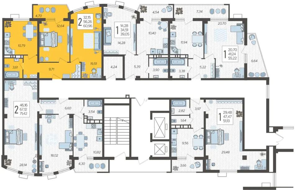 | 2-комн. | 61 - 68 м² | 8,7 - 9,6 млн ₽ |